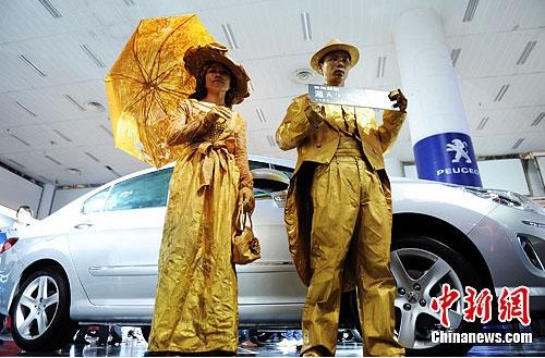 5月3日,以“樂(lè)享生活”為主題的2012湖南車(chē)展在湖南國(guó)際會(huì)展中心開(kāi)幕。參展商們?yōu)槲M(fèi)者,各想奇招。在某品牌汽車(chē)展區(qū)前,兩位裝扮成活體雕塑的人手拿車(chē)牌進(jìn)行促銷(xiāo),吸引了眾多消費(fèi)者的眼球。(來(lái)源:中新網(wǎng))