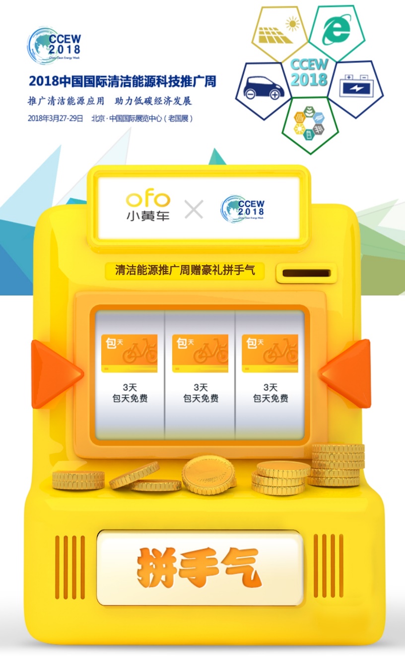 熟悉小黃車(chē)的用戶(hù)都知道,月卡和騎行券一直是ofo的固定福利模式,而全新上線(xiàn)的手氣卡,則將ofo的福利資源進(jìn)行了全面整合。手氣卡是一個(gè)包含月卡、周卡、騎行券、折扣券等多重優(yōu)惠福利的大禮包,用戶(hù)通過(guò)老虎機(jī)搖獎(jiǎng)即可隨機(jī)獲得不同種類(lèi)的優(yōu)惠獎(jiǎng)品。參與2018中國(guó)國(guó)際清潔能源科技推廣周與ofo小黃車(chē)聯(lián)名手氣卡的方式非常簡(jiǎn)單,活動(dòng)期內(nèi),用戶(hù)可通過(guò)推廣周官方微博、微信、EDM等平臺(tái)找到活動(dòng)消息: