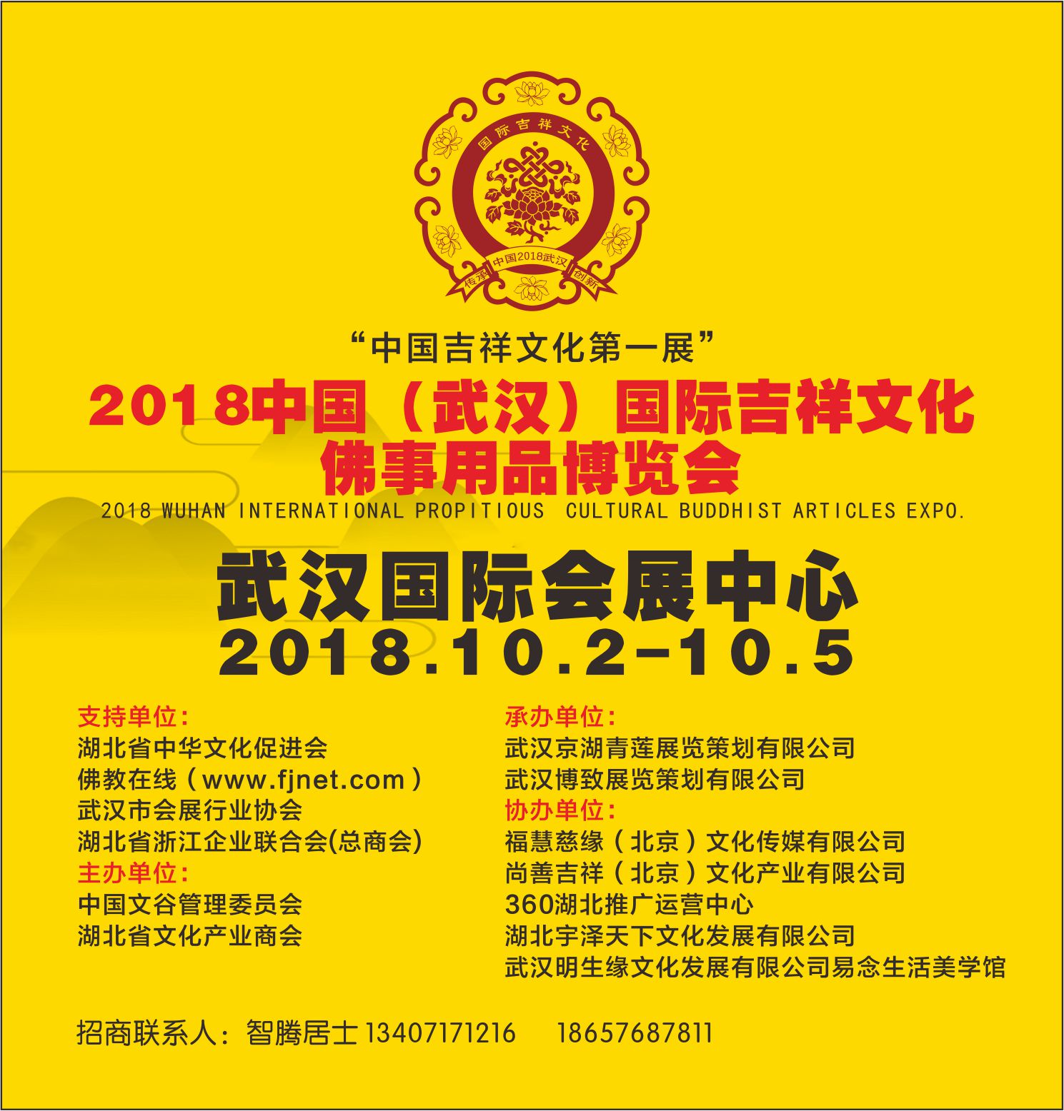 武漢佛事展倒計時60天,感謝“佛教在線”、“佛寶網”、“弘慧網”、“三寶地云寺院APP”等行業(yè)權威媒體的戰(zhàn)略合作和全面支持。