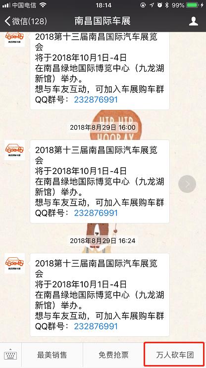 1、即日起至9月30日,通過微信關(guān)注“南昌國(guó)際車展”,點(diǎn)擊【萬(wàn)人砍車團(tuán)】按鈕進(jìn)入專題,選擇喜歡的汽車品牌即可免費(fèi)報(bào)名參加“南昌國(guó)際車展官方萬(wàn)人砍車團(tuán)”活動(dòng)(每人限報(bào)一個(gè)砍車團(tuán));