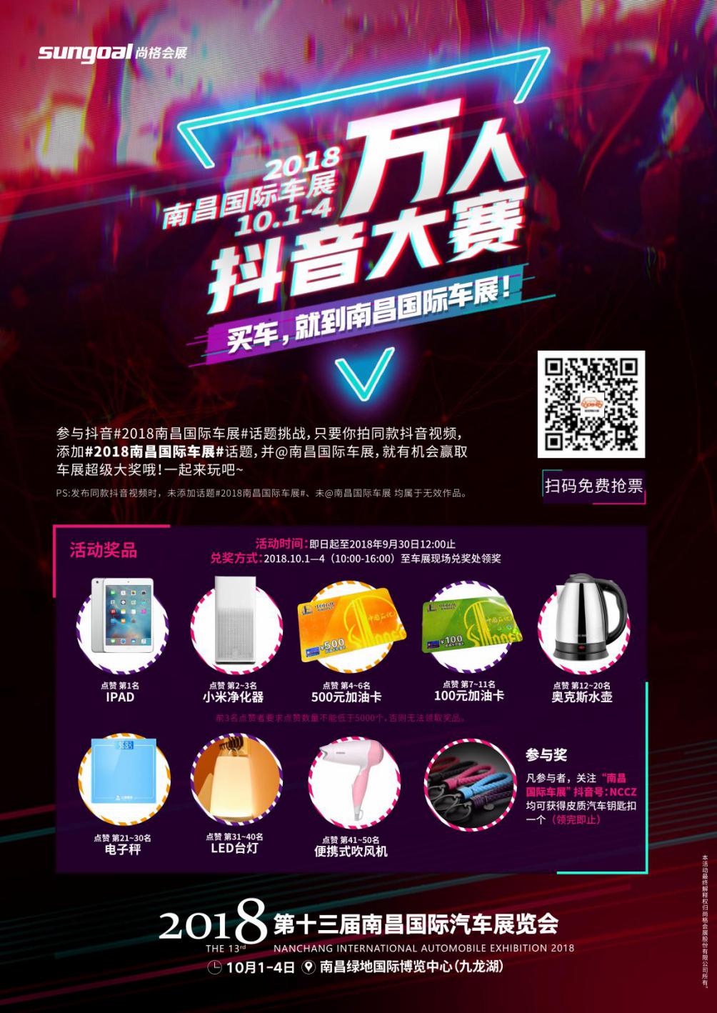 除此之外,娛樂活動也是南昌國際車展必不可少的,首屆萬人抖音大賽“買車,就到南昌國際車展”已于9月10日12:00-9月30日12:00正式開啟。