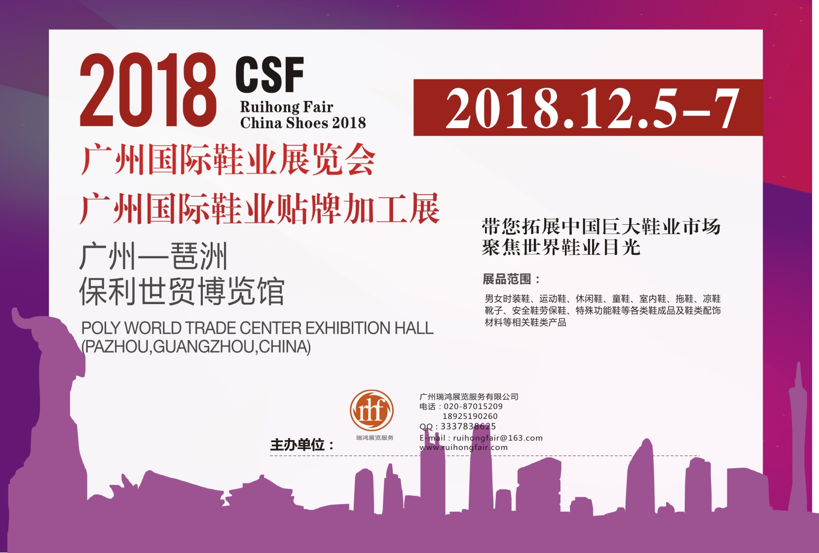 CSF China Shoes Fair廣州國(guó)際鞋業(yè)展覽會(huì)是由廣州瑞鴻展覽服務(wù)有限公司聯(lián)合打造的制鞋行業(yè)專業(yè)成品鞋業(yè)展覽會(huì)。2018年展覽將于12月5日-7日在廣州-琶洲-保利世貿(mào)博覽館再度舉行。