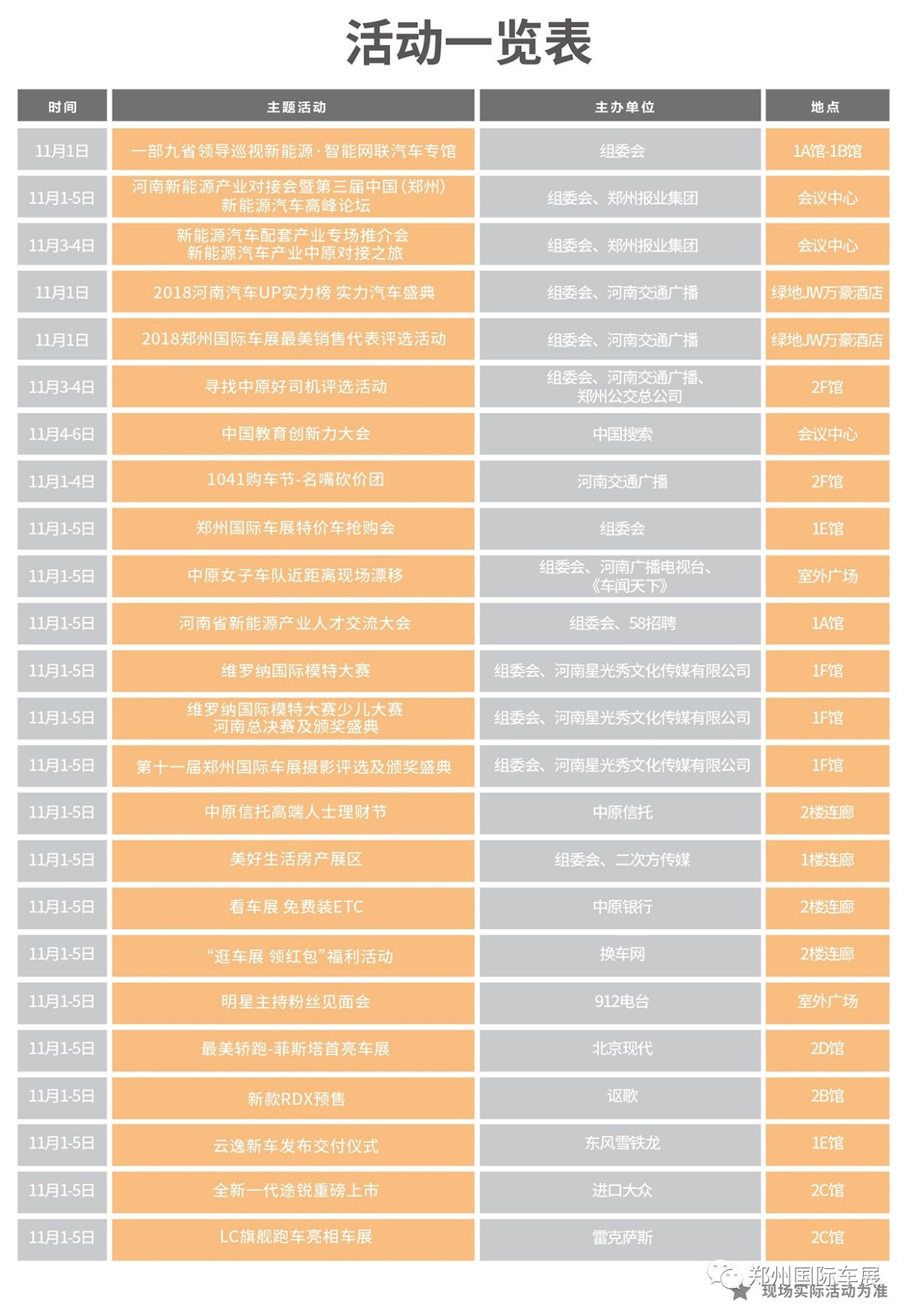 溫馨提醒:11月3日(周六),與車展同期舉辦的2018鄭州國(guó)際馬拉松賽事,將對(duì)商務(wù)內(nèi)環(huán)路部分路段臨時(shí)封閉,請(qǐng)?zhí)崆耙?guī)劃觀展時(shí)間,開車觀展的可停在商務(wù)外環(huán)各地下停車場(chǎng),小展建議最好搭乘公共交通方便出行。