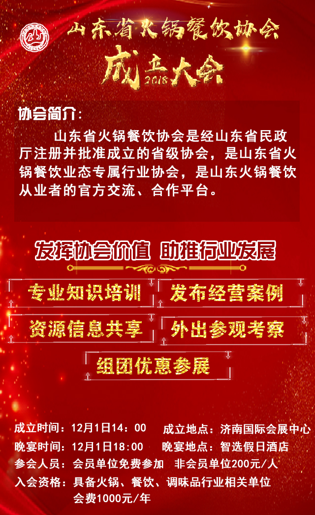 山東省火鍋餐飲協(xié)會是經(jīng)山東省民政廳注冊并批準(zhǔn)成立的省級協(xié)會,是山東省火鍋餐飲業(yè)態(tài)專屬行業(yè)協(xié)會,是山東火鍋餐飲從業(yè)者的官方交流、合作平臺。協(xié)會貫徹落實政府“食安山東”品牌建設(shè),為山東火鍋餐飲行業(yè)的上中下游企業(yè)搭橋引線,做好行業(yè)的規(guī)范和服務(wù)工作。給大家搭建一個信息交流、資源共享、互幫互助、抱團發(fā)展的平臺。