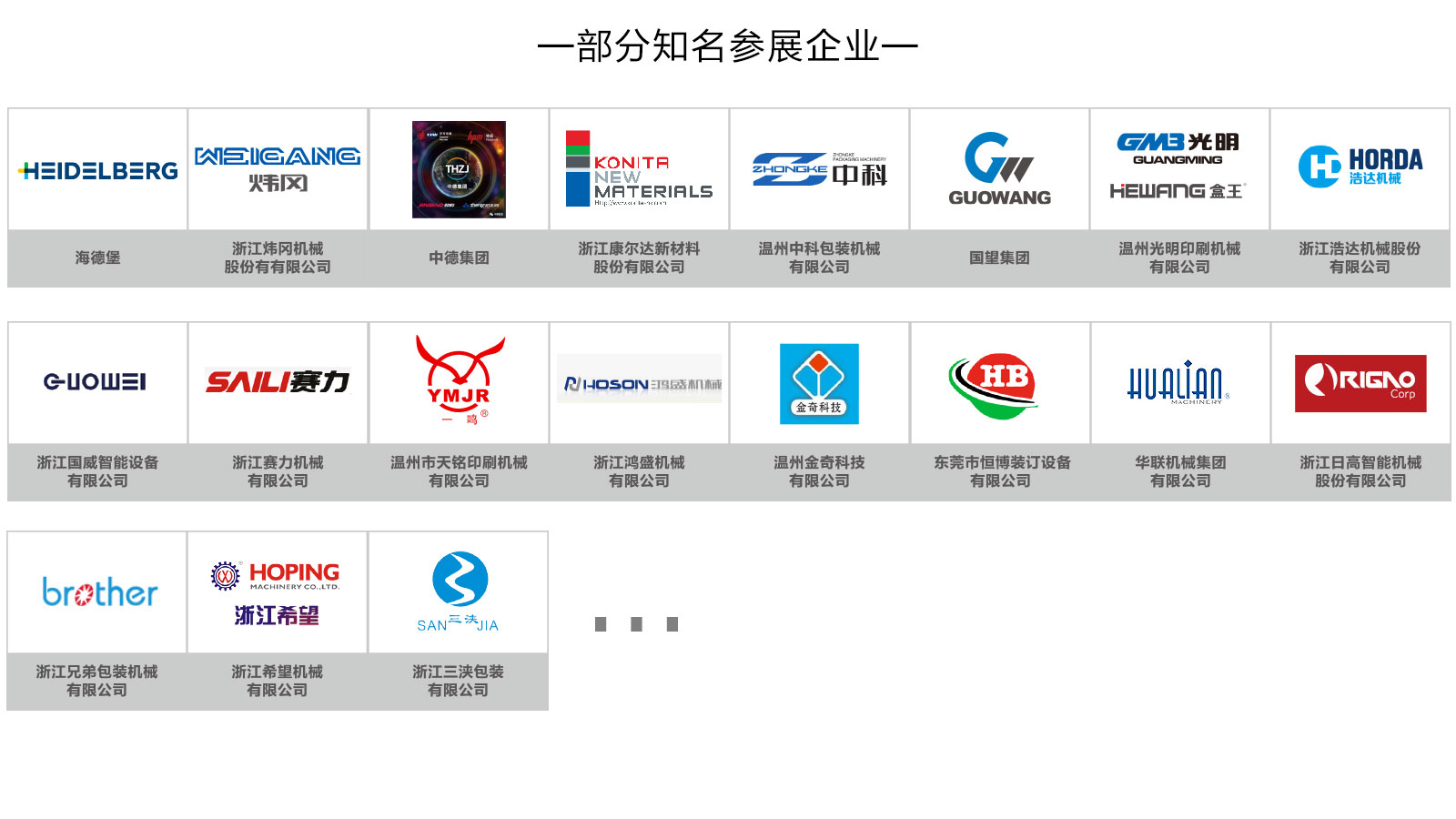 展會(huì)依托溫州——“中國印刷城”、“中國包裝機(jī)械城”、“中國印刷材料交易中心”、“中國印刷設(shè)備制造業(yè)第一區(qū)域品牌”、全球優(yōu)質(zhì)制造商聚集地產(chǎn)業(yè)高地優(yōu)勢(shì)和強(qiáng)勁的市場(chǎng)需求,吸引國內(nèi)外知名企業(yè)、品牌參展,展會(huì)展出產(chǎn)品涵蓋印刷、包裝、廣告標(biāo)識(shí)、數(shù)碼印花、圖文快印等品類。海德堡、煒岡、中德、康爾達(dá)、中科、國望、光明、浩達(dá)、國威、賽力、天銘等印刷行業(yè)龍頭企業(yè)悉數(shù)參與展會(huì);“智能包裝產(chǎn)業(yè)技術(shù)聯(lián)盟”成員華聯(lián)、日高、希望以及兄弟、三浹等包裝設(shè)備知名企業(yè)將攜新品展出;此外,博印、金奇、明睿等數(shù)碼印花、圖文快印、廣告標(biāo)識(shí)企業(yè)也將共襄盛會(huì)。