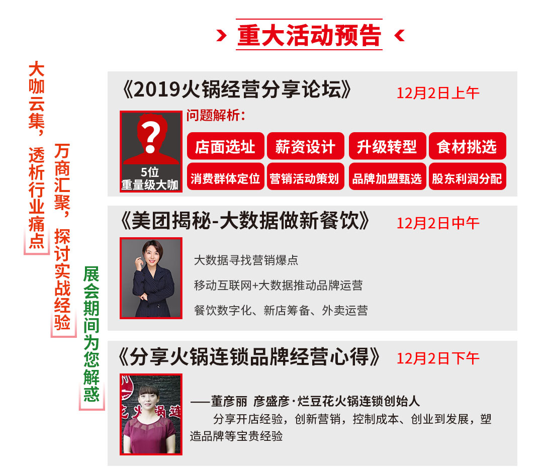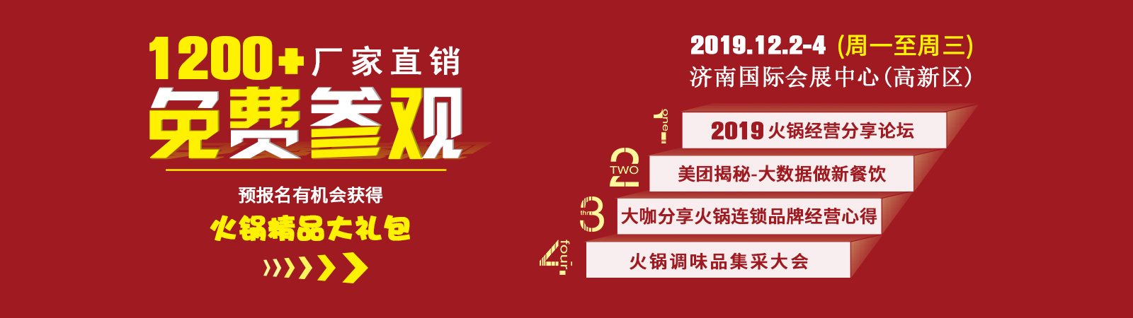 2019全國(guó)最大規(guī)模冬季火鍋盛會(huì)即將開(kāi)幕,火鍋、調(diào)味品等餐飲全產(chǎn)業(yè)鏈1200 家廠家直銷,90000種新品、爆品、暢銷品。
