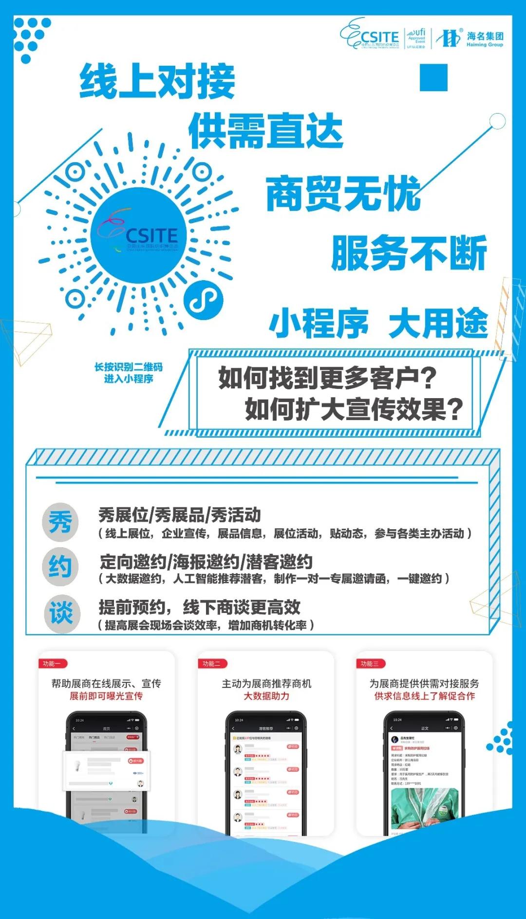 海名線上會(huì)展部將為展商提供365天不間斷服務(wù),實(shí)現(xiàn)線上供需匹配,商貿(mào)無憂!同時(shí),逐步開展圍繞展商和專業(yè)觀眾的線上云展示、云對(duì)接,包括B2B品類細(xì)化直播、訂單一鍵匹配,以及長線布局垂直行業(yè)會(huì)展關(guān)聯(lián)的B2B線上云平臺(tái)等。海名國際會(huì)展集團(tuán)將在數(shù)字化轉(zhuǎn)型道路上,不斷疊加網(wǎng)絡(luò)化、科技化的新展覽服務(wù),推動(dòng)“會(huì)展+”服務(wù)新模式,實(shí)現(xiàn)線上線下展覽同開,千人千面的個(gè)性化服務(wù)。