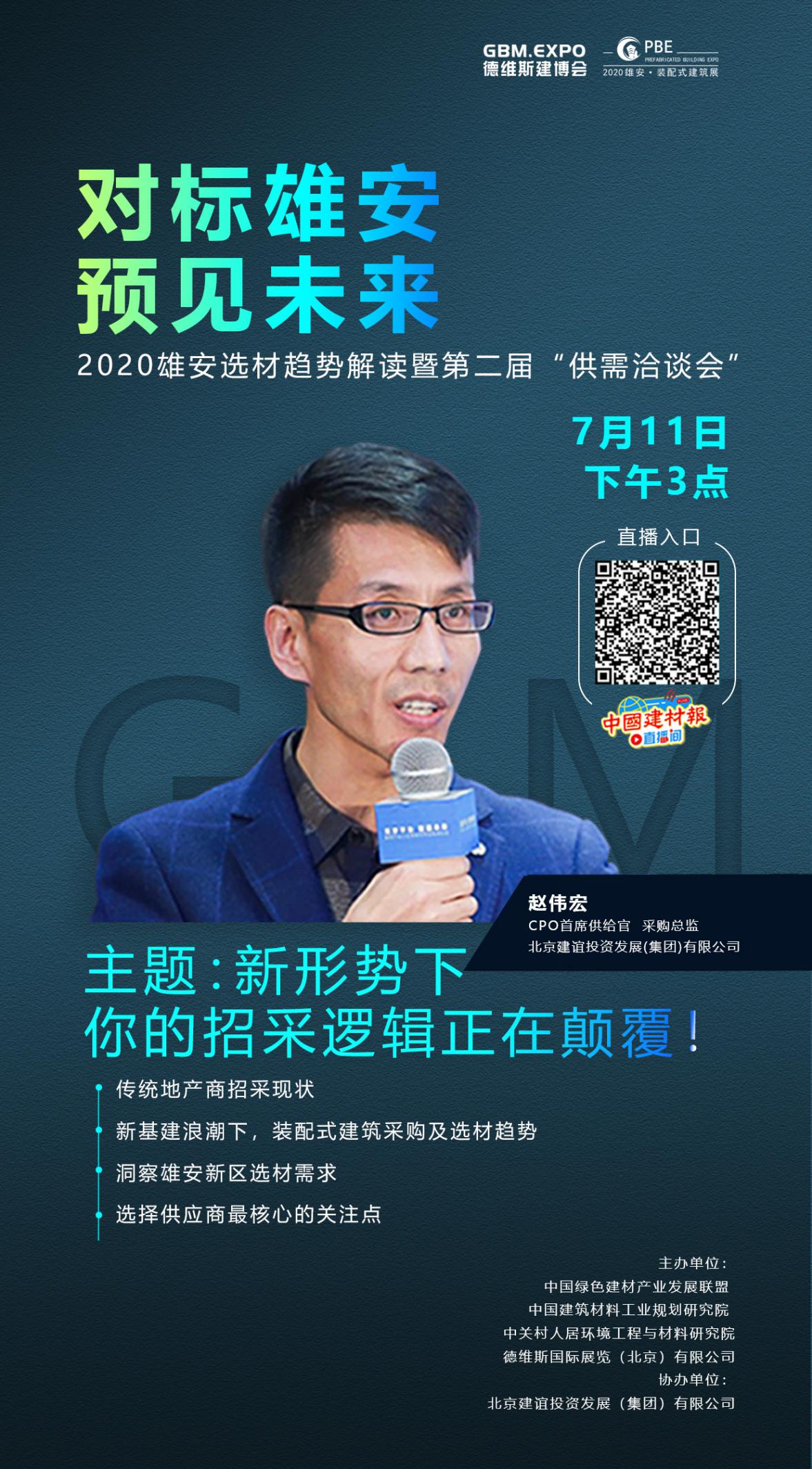 2020年7月11日,第四屆雄安德維斯建博會(huì)線上直播系列活動(dòng)之——對(duì)標(biāo)雄安,預(yù)見(jiàn)未來(lái):2020雄安選材趨勢(shì)解讀暨第二屆“供需洽談會(huì)”將邀請(qǐng)北京建誼投資發(fā)展(集團(tuán))有限公司采購(gòu)總監(jiān)趙偉宏,分享傳統(tǒng)地產(chǎn)商招采現(xiàn)狀及新基建浪潮下裝配式建筑采購(gòu)選材趨勢(shì),講述海外地域經(jīng)濟(jì)招采管理經(jīng)驗(yàn)、雄安新區(qū)選材要求。