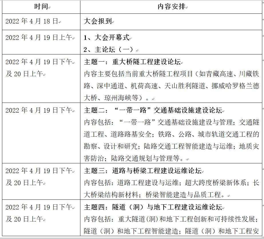 鑒于當(dāng)前國內(nèi)新冠疫情高發(fā),為響應(yīng)國家疫情防控工作要求,切實(shí)保障參會(huì)專家和代表的健康與安全,確保會(huì)議高質(zhì)量舉辦,經(jīng)大會(huì)主席團(tuán)及組委會(huì)審慎研究決定:原定于2021年11月25日-26日在上海舉辦的“2021(第十屆)國際橋梁與隧道技術(shù)大會(huì)暨‘一帶一路’交通基礎(chǔ)設(shè)施高端論壇”延期至2022年4月19日-20日舉辦。