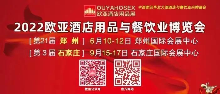 第21屆(鄭州)歐亞酒店用品與餐飲業(yè)博覽會(huì)將于2022年6月10-12日在鄭州國(guó)際會(huì)展中心舉辦;第3屆(石家莊)歐亞酒店用品與餐飲業(yè)博覽會(huì)將于2022年9月15-17日在石家莊國(guó)際會(huì)展中心舉辦。