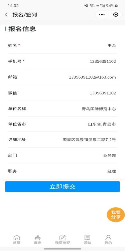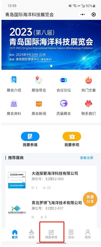 點(diǎn)擊展商秀底邊欄中央的【我要參會】按鈕,直接報(bào)名參加青島海科展,避免現(xiàn)場登記注冊麻煩。提前預(yù)登記的觀眾還可以享有免費(fèi)午餐等展會特權(quán)!